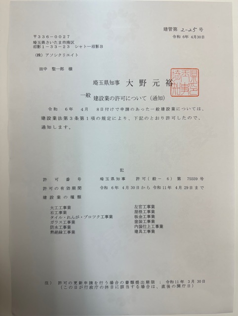 建設業許可 一般建設業 埼玉県知事 許可(般-4)第75559号